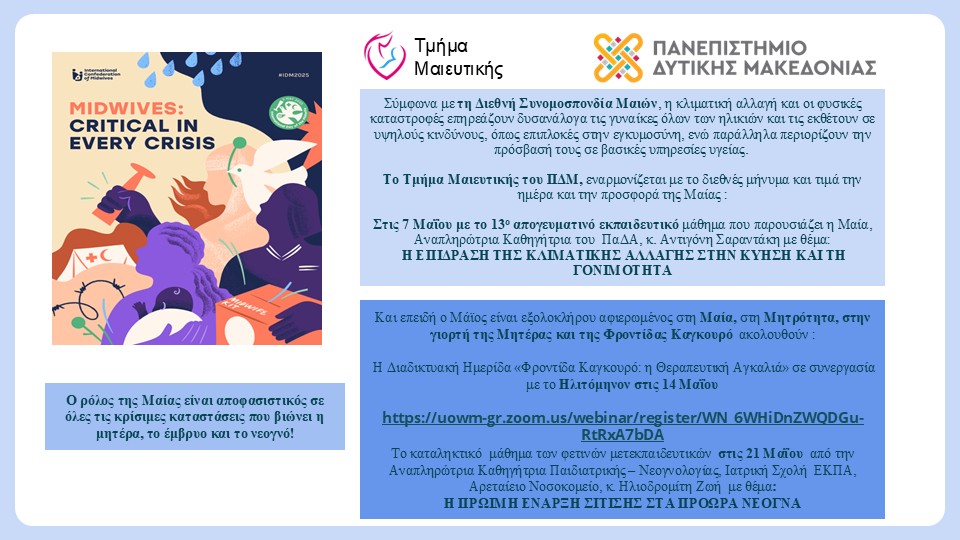 το Τμήμα Μαιευτικής του Πανεπιστημίου Δυτικής Μακεδονίας οργανώνει μια σειρά από διαλέξεις και δράσεις.