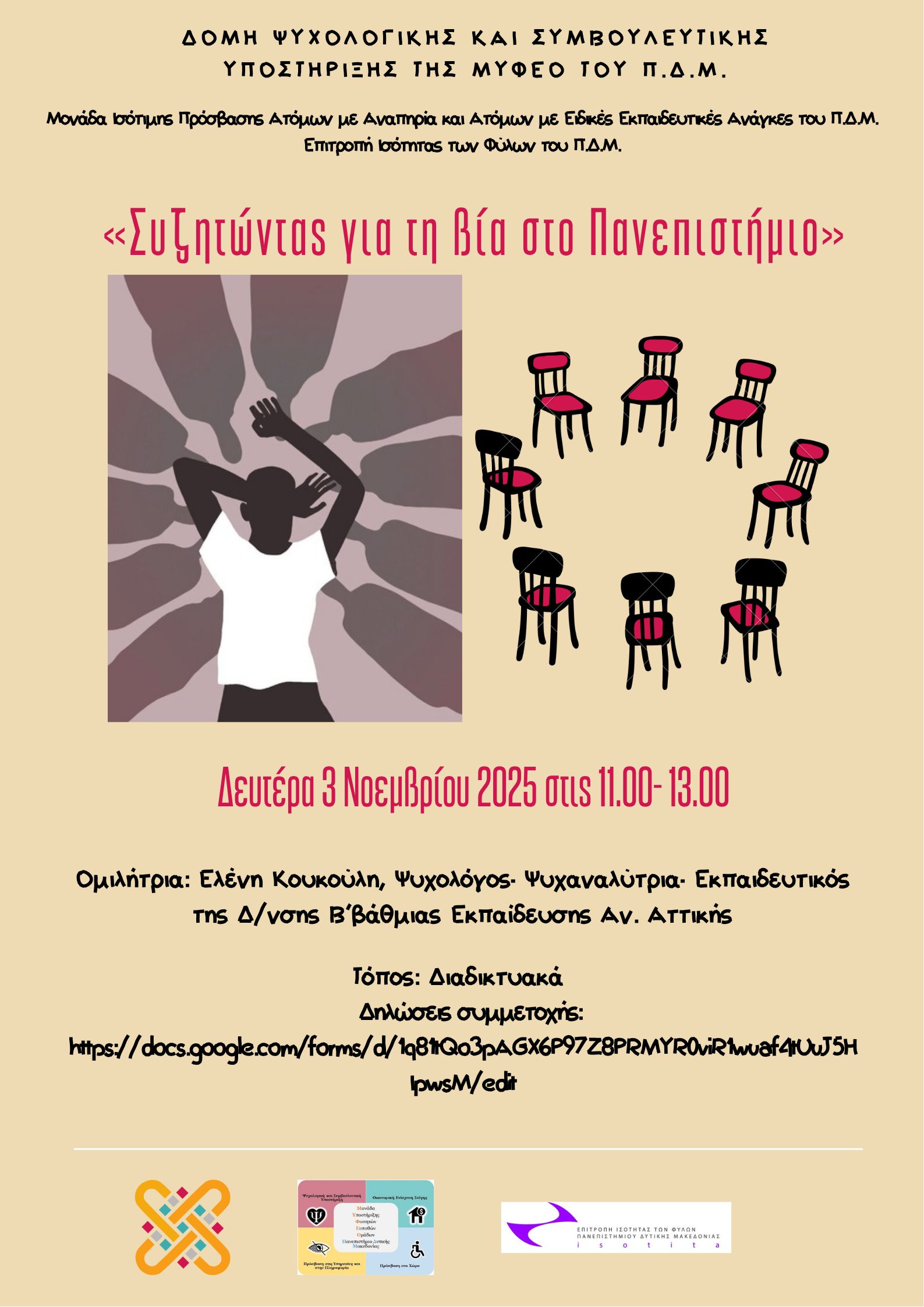 Στο πλαίσιο λειτουργίας της Δομής Ψυχολογικής και Συμβουλευτικής Υποστήριξης (ΔΟ.ΨΥ.Σ.Υ.) της Μονάδας Υποστήριξης Φοιτητών Ευπαθών Ομάδων (ΜΥΦΕΟ) του Πανεπιστημίου Δυτικής Μακεδονίας (Π.Δ.Μ.), η οποία χρηματοδοτείται από το Έργο «Ψυχολογική και Συμβουλευτική Υποστήριξη Ανθρώπινου Δυναμικού ΠΔΜ (κωδ. rescom: 81081)», ανακοινώνουμε τη διοργάνωση νέας δράσης με τίτλο: «Συζητώντας για τη βία στο Πανεπιστήμιο». Κεντρική ομιλήτρια θα είναι η κα Ελένη Κουκούλη, Ψυχολόγος, Ψυχαναλύτρια, και Εκπαιδευτικός και της Διεύθυνσης Δευτεροβάθμιας Εκπαίδευσης Ανατολικής Αττικής.