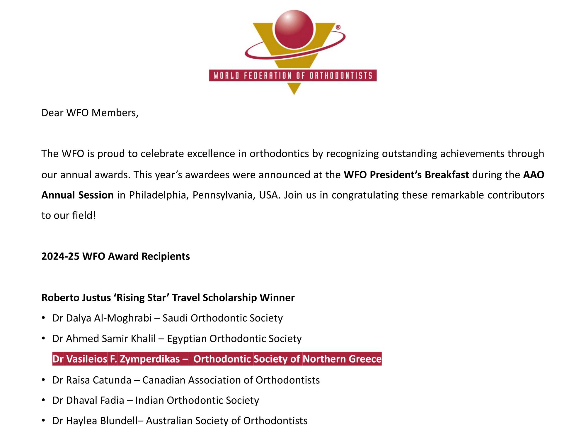 Ο υποψήφια διδάκτωρ του Τμήματος Μαιευτικής κ. Β. Ζυμπερδίκας επελέγη κατόπιν αξιολόγησης, με συν-υποψήφιους σε διεθνές επίπεδο. Σύμφωνα με την Ομοσπονδία, “αυτό το βραβείο απονέμεται σε μέλη της Παγκόσμιας Ομοσπονδίας Ορθοδοντικών, τα οποία, κατά την κρίση της Ομοσπονδίας και με βάση την αξιολόγηση του βιογραφικού τους, έχουν διαπρέψει στον τομέα της Ορθοδοντικής και θα πρέπει να λάβουν υποστήριξη για να παρουσιάσουν την ερευνητική ή/και κλινική τους εργασία διεθνώς”. Η Εκτελεστική Επιτροπή της Ομοσπονδίας αποτελείται από τον Πρόεδρο της Ομοσπονδίας Professor Nikhillesh Vaiid, τον Αντιπρόεδρο Δρ. Παναγιώτη Σκουλαρίκη, την Professor Letizia Perillo, τον Professor Khaled AboulAzm .