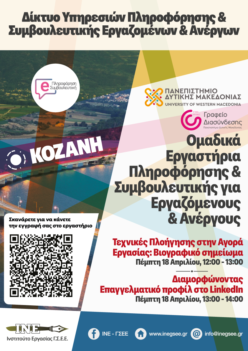 Το Γραφείο Διασύνδεσης του Πανεπιστημίου Δυτικής Μακεδονίας, σε συνεργασία με το Περιφερειακό ΙΝΕ – ΓΣΕΕ Δυτ. Μακεδονίας / Κοζάνης, διοργανώνουν ΔΙΑΔΙΚΤΥΑΚΟ Εργαστήριο Συμβουλευτικής Πληροφόρησης την Πέμπτη 18 Απριλίου 2024 και ώρα 12:00-14:00, μέσω Webinar.
